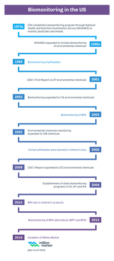 In the 1970s, the National Biomonitoring Program was established by the U.S. Centers for Disease Control and Prevention (CDC). Biomonitoring specimens from the U.S. population have been collected through the National Health and Nutrition Examination Survey (NHANES). This program monitors the levels of environmental chemicals in the U.S. population and assesses trends over time.
